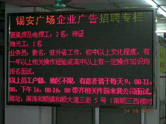 【产品型号】:5.0室内双色LED电子屏【产品间距】:7.62mm【产品用于】:室内使用,广泛用于人才就业中心、企业、机关单位、商场、酒店、车站、机场等场所,可显示公告信息、通知、新闻等等【产品特点】:室内双色LED显示屏,主要用于显示文字和简单图形,价格低,可以随意变换显示信息,具有操作简单、方便,性能稳定使用寿命长,节能省电等特点。它通过与计算机通讯输入信息,一台计算机可以控制多块LED显示屏,且可以脱离电脑主机显示,也可以直接读取U盘的内容。这类LED电子显示屏主要用于显示文字,一般无灰度控制。它通过与计算机通讯输入信息。显示的字体字型丰富,操作简单,使用方便、方便!一台计算机可以控制多块LED显示屏,且可以脱离电脑主机显示,也可以直接读取U盘的内容。祺创LED电子显示屏采用优质的原材料和专业的工艺技术,产品具有:性能稳定,使用寿命长,节能省电等特点!祺创LED电子显示屏品质好,通过ISO9001和CE认证,产品价格实惠,深受广大客户的青睐。5.0室内单色LED电子显示屏技术指标1像素点形状与尺寸圆形,直径5mm2像素点中心距7.62mm3像素晶片构成1红+1绿4每平方米像素数量17220点5单元板尺寸(W*H)488mm*244mm6功耗单色:50W-300W/㎡7屏幕重量(不含支撑结构)<25kg/m28单元板解析度(W*H)64点*32点9视角水平≥160°,垂直上下≥160°10屏幕亮度(平均值)≥800cd/m211供电要求220V±15%50Hz12可显示颜色红色、绿色、黄色13显示模式VGA640X480—VGA1600X102414屏幕寿命大于100,000小时15画面刷新频率≥360HZ16通信距离异步屏:≤1200M(8芯双绞线无中继)/20000M(光纤),同步屏:≤100M(8芯双绞线无中继)17相对温度—25℃~+60℃18相对湿度10%—95%RH19控制软件专用显示屏控制软件20最佳可视距离正面8--50m以内21通信接口VGA或者RS232、RS48522控制方式计算机异步或者同步控制